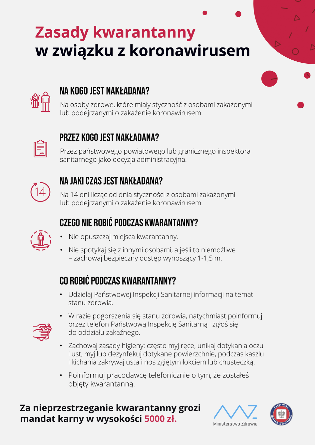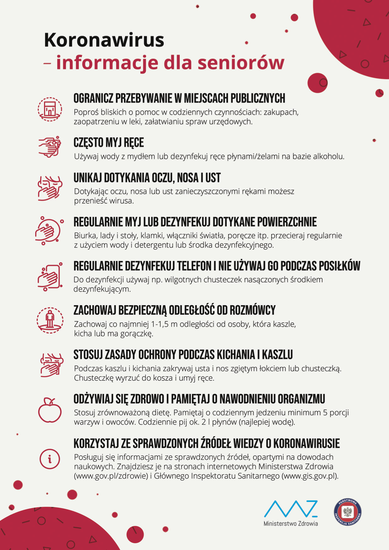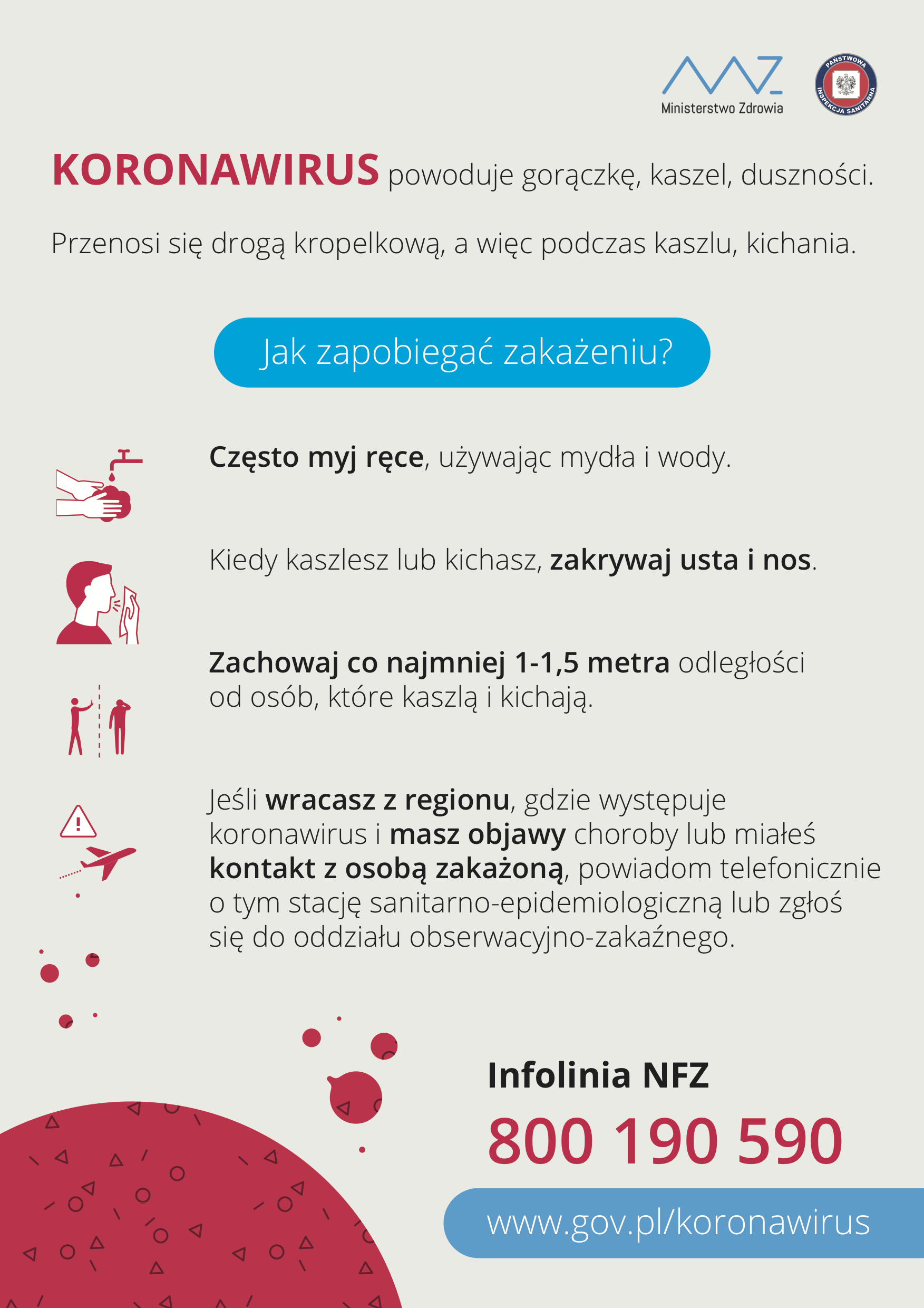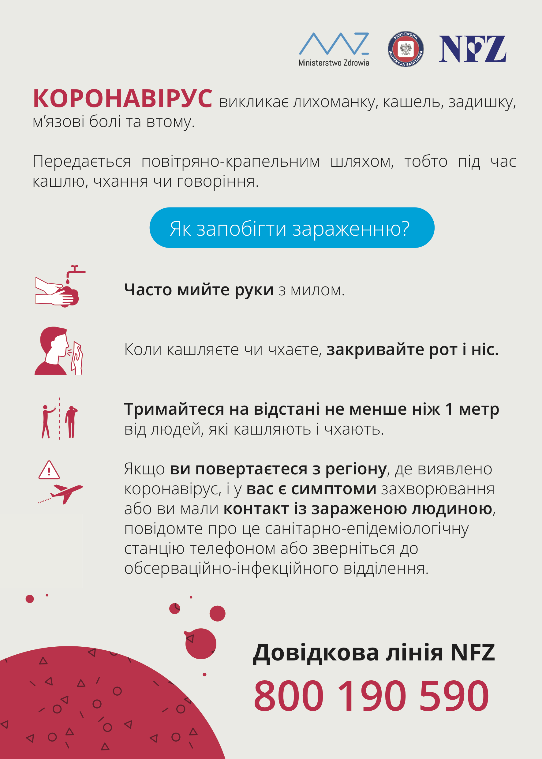 Prezentujemy do Państwa wiadomości cztery plakaty z podstawowymi informacjami dotyczącymi Koronowirusa – jak zapobiegać zakażeniu w języku polski i języku ukraińskim, zasadami postępowania podczas kwarantanny w związku z koronawirusem, oraz informacjami dla seniorów.